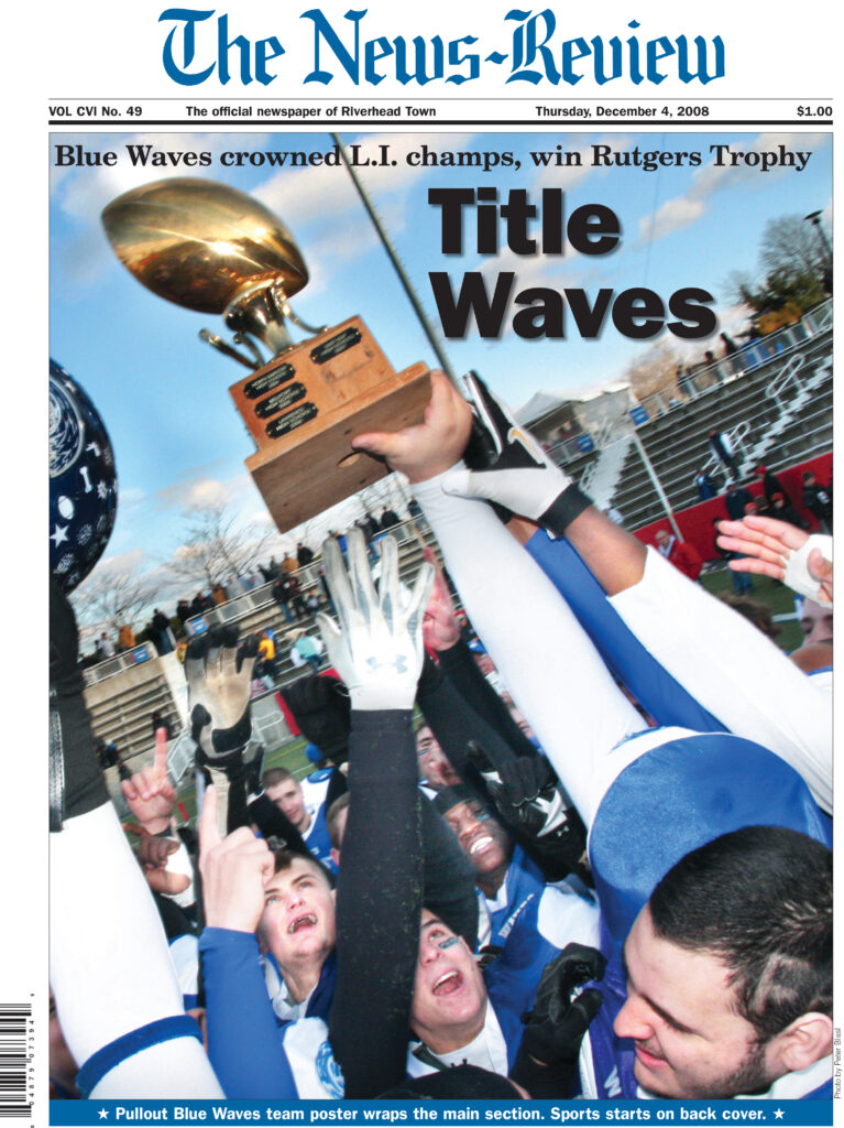 I remember watching crazy legs Eddie Wansor at quarterback, the bruiser Mike Owen at halfback and soft-hands Mike Heigh at tight end in 2003 when they won the Suffolk County championship at Stony Brook University. I was in the stands — watching with pride and admiration. Longtime radio voice of the Blue Waves Pat Kelly took me along to watch the game, as I was very good friends with his son.