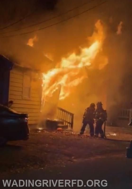 Multiple callers reported seeing flames shoot out of the house. Crews from Wading River, Riverhead, Ridge, Rocky Point and Manorville fire departments worked in gusty winds and icy conditions to extinguish the flames 38 minutes after the call came in at 1:07 a.m., according to the Wading River Fire Department.