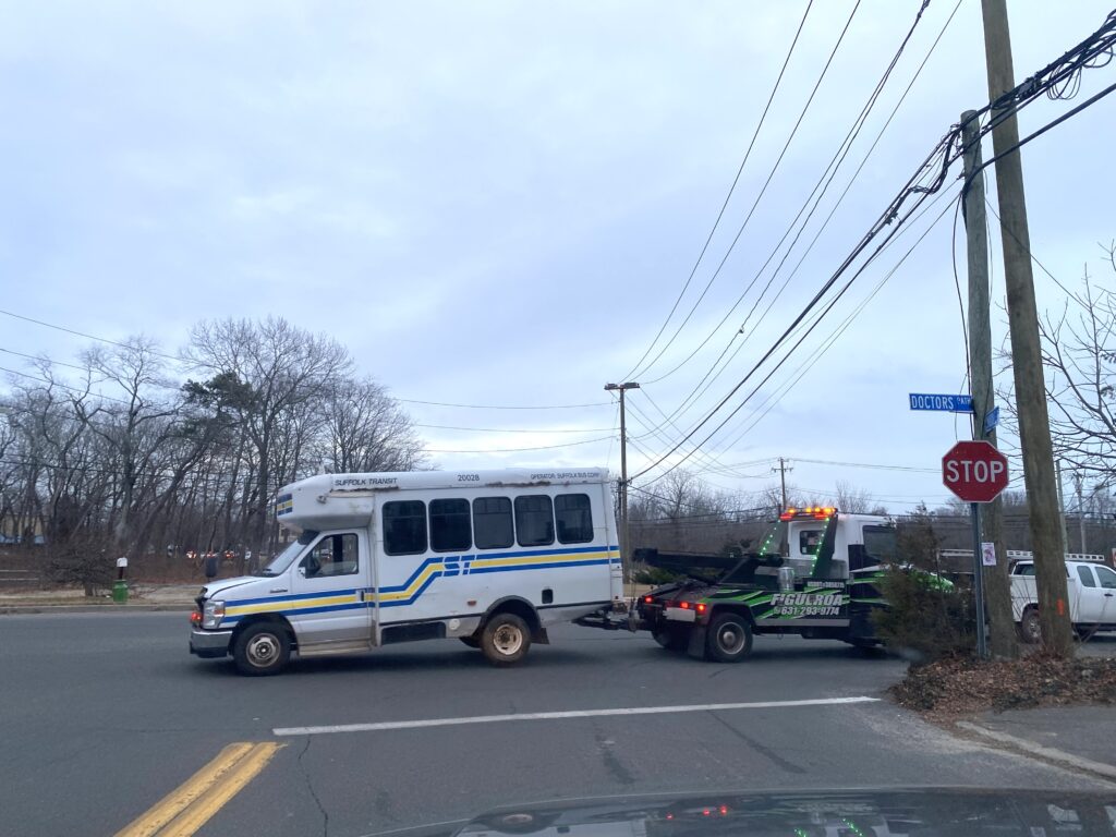 The Montauk Bus Company mini school bus was traveling northbound on Northville Turnpike and the Suffolk County transit bus was heading eastbound on Doctors Path when they collided at the intersection around 3:15 p.m., police said. The collision flipped the transit bus, which was carrying a driver and one adult passenger, onto its side.