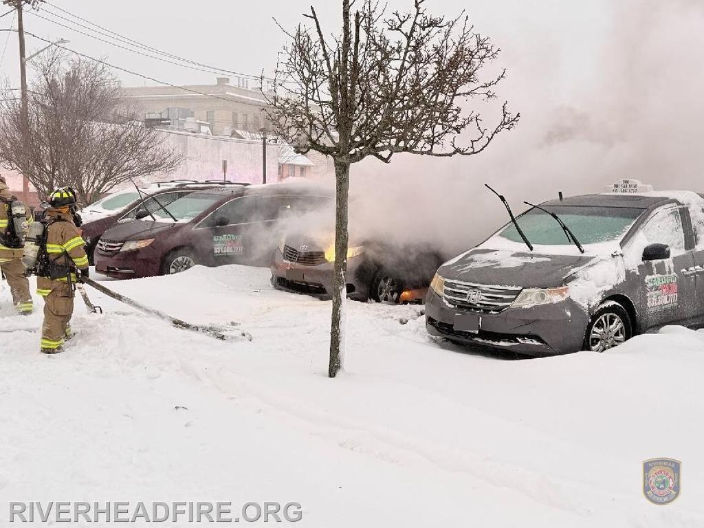 An empty taxi parked across the street from the Riverhead train station erupted in flames as snow blanketed the region on Sunday, officials said.