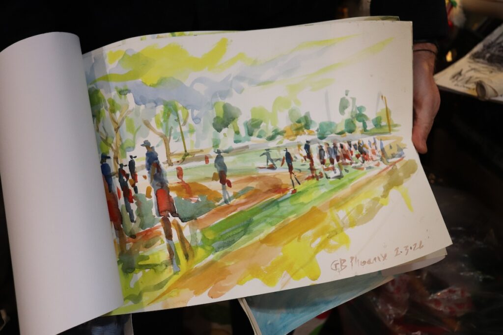 “You meet many people when you’re painting,” he said. “People come and talk to you and tell you their stories … I try and capture the culture of baseball, the culture of the sport, the culture of the place we are, the people I meet and the game itself.”