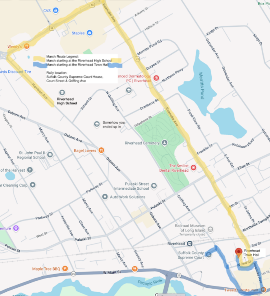The march in Riverhead will begin at noon at Riverhead High School and continue to Riverhead Town Hall and then to the New York State Supreme Court on Griffing Avenue, where a rally is scheduled for 1:30 p.m. The Greenport rally will be held in Mitchell Park from 10 a.m. to noon. Another demonstration, led by indivisibleli.org, will be held at Riverhead County Center from 9 a.m. to 11 a.m.